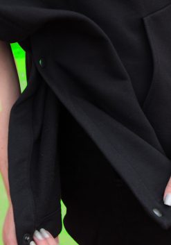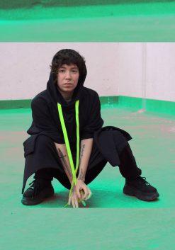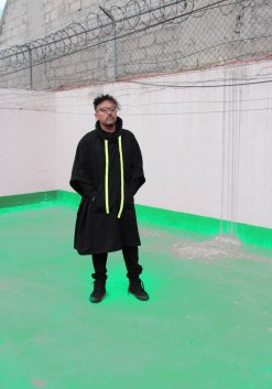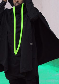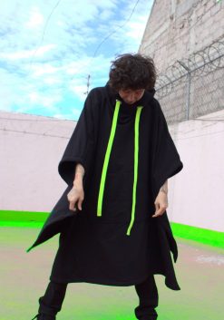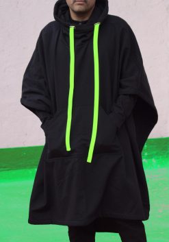 Poncho largo de felpa. Con bolsa de sudadera y capucha ancha con cintas en negro o en amarillo fosforescente. Este modelo está hecho bajo el esquema zero waste, donde utilizamos al máximo la tela, eliminando el desperdicio y usando el remanente para otras producciones.